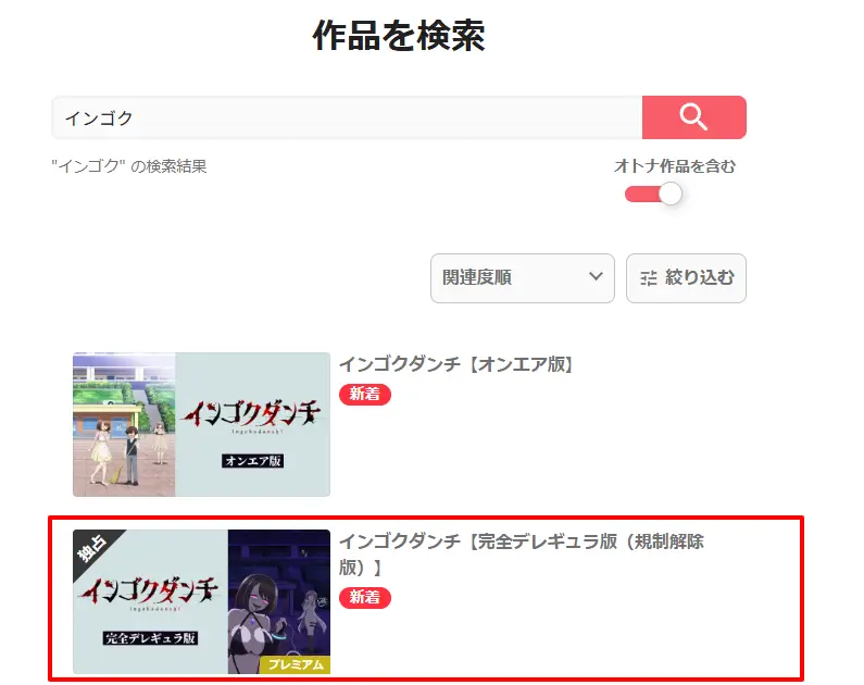 インゴクダンチの規制解除版はアニメフェスタのプレミアムプランの独占配信となっています。