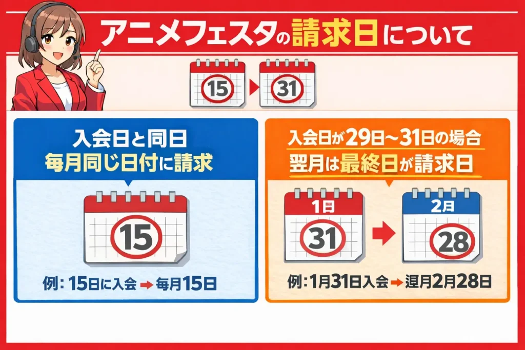 アニメフェスタで設定した場合、月額料金はau側の請求に合算され、決済確定日は入会日に連動します(1〜28日入会は同日課金。月末入会は扱いが変わるルールあり)。