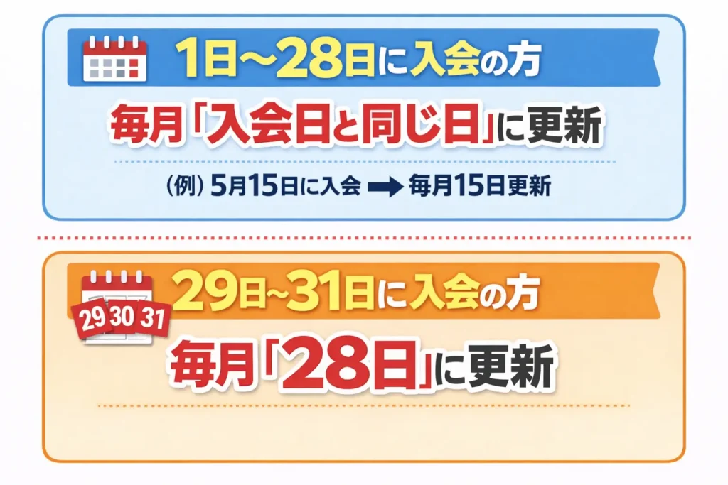 ・入会日と同日(例:15日に入会した場合、毎月15日)